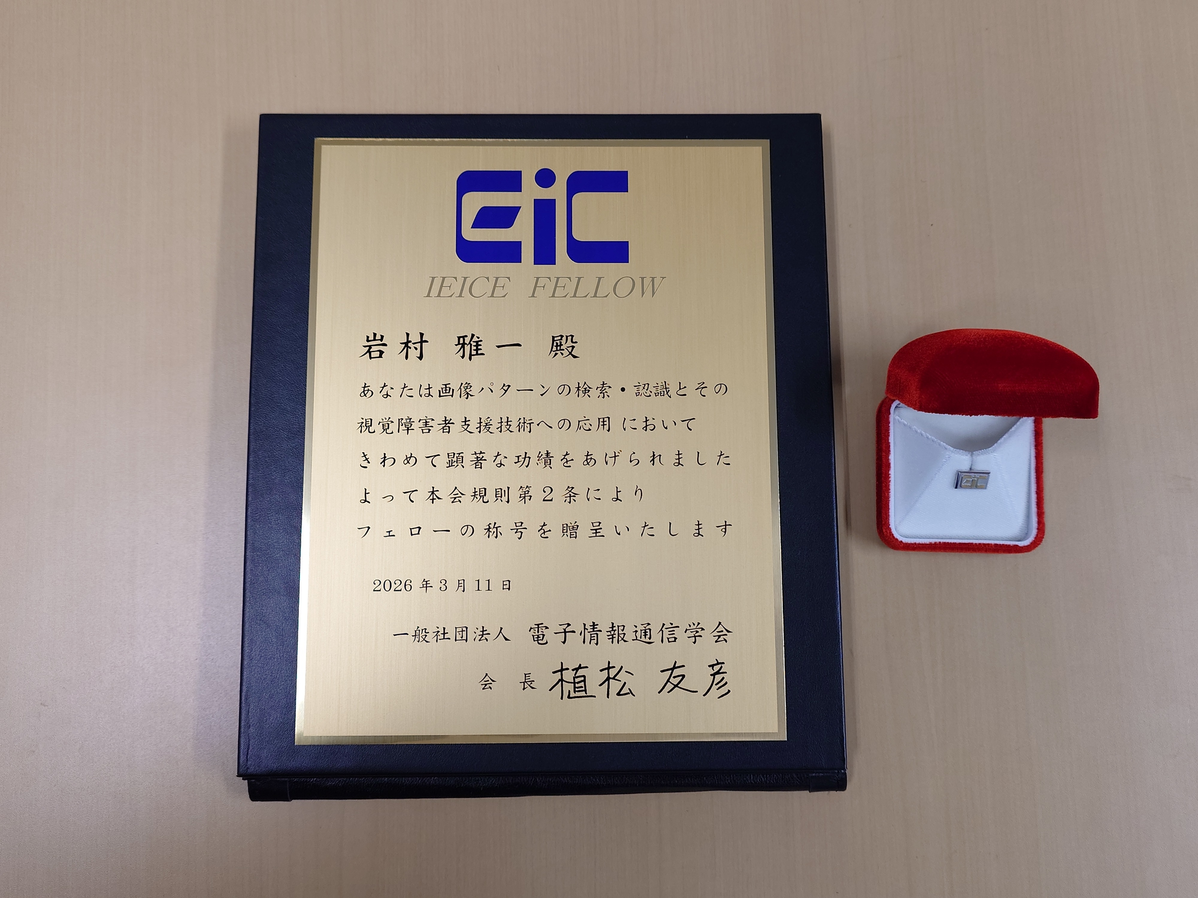 岩村雅一教授が、「画像パターンの検索・認識とその視覚障害者支援技術への応用」の功績により、電子情報通信学会からフェローの称号を贈呈されました。